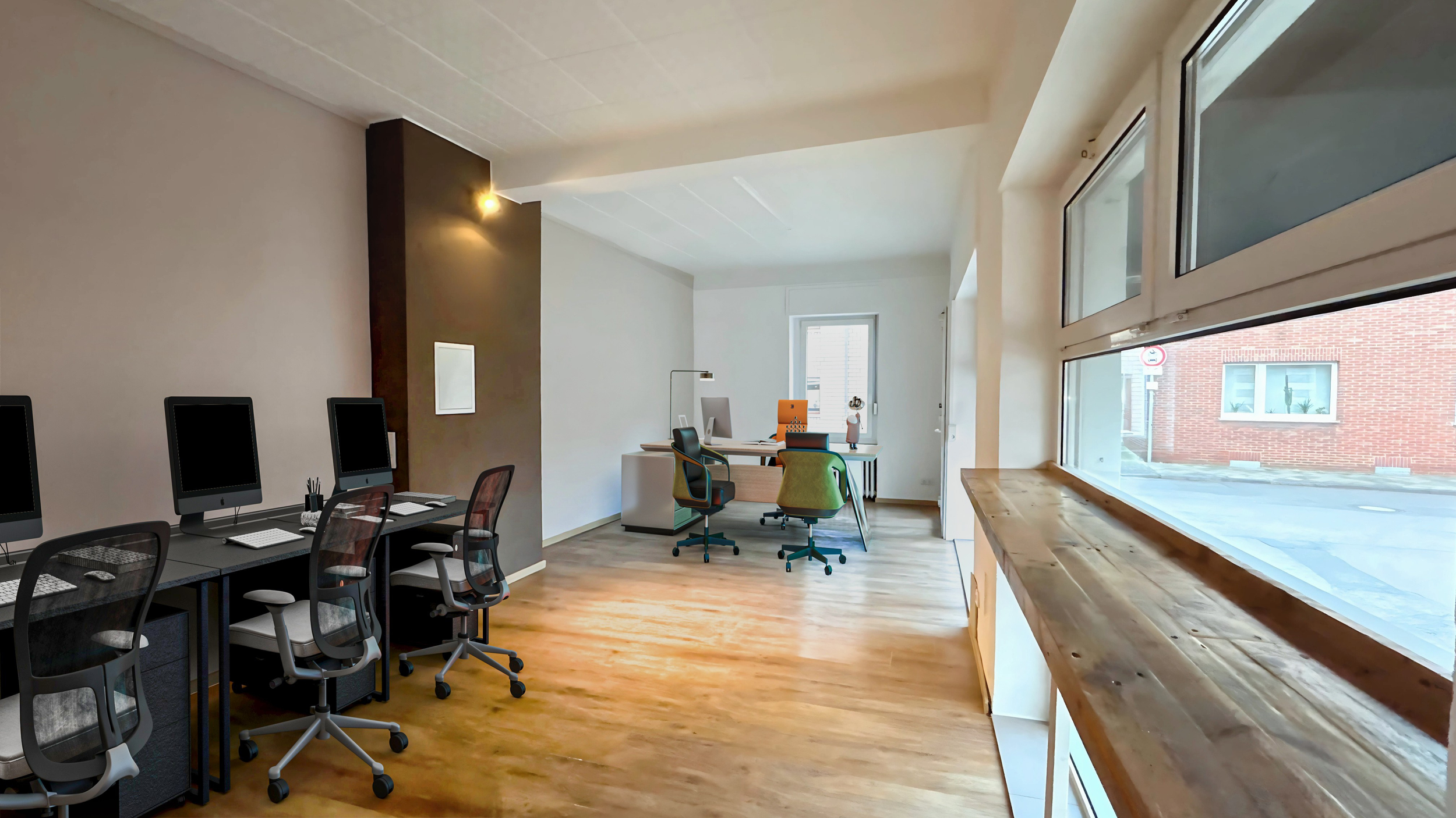 - Holzbodenbelag: Schafft eine moderne und einladende Arbeitsatmosphäre.